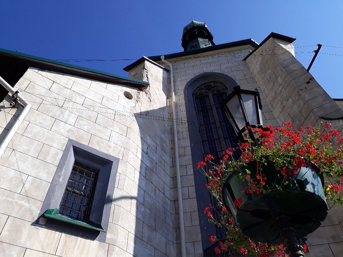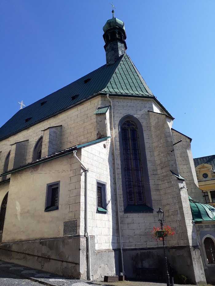 Nádherný, pôvodne gotický kostol - podľa mňa najkrajší v Štiavnici. Stojí na dolnom okraji Trojičného námestia. Nedeľné ráno je výborná príležitosť obzrieť si ho zo všetkých strán, z chodníkov aj z cesty. Bez hluku motorov a ozveny všemožných strojov, ktorých je Štiavnica v pracovné dni plná. Takže vychutnávame atmosféru naplno.