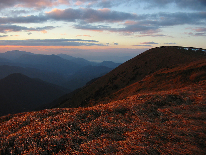 Západ slnka na Veľkom boku vo východných Nízkych Tatrách. Úžasný zážitok. Neskorá jeseň, stopy roztopeného prvého snehu, skvelá dohľadnosť. V pozadí dolina Hodruša, vrch Ohnište, okolie Malužinej.