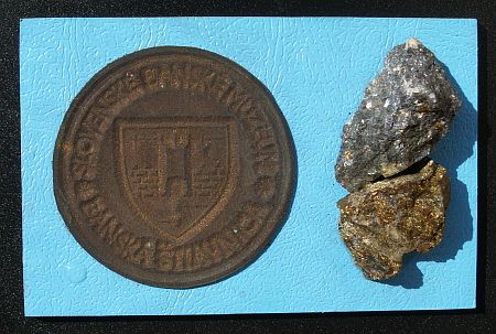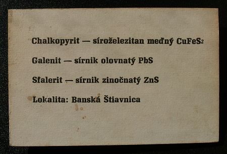 Na hornej strane, ktorá má modré sfarbenie sú nalepené dve vzorky štiavnických minerálov. Svetložltý, zlatistý chalkopyrit a sivý kamienok, ktorý je zmesou galenitu a sfaleritu. Galenit má kovový lesk a sivú farbu, sfalerit má lesk polokovový, takmer sklený a farbu hnedočiernu.
