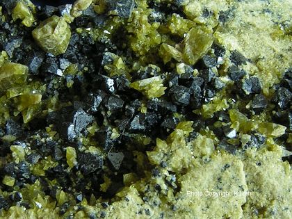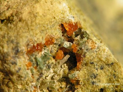 Pleonastové povlaky kryštálikov zase nájdeme na masívnej fassait/pleonastovej škvrnitej matrici s poréznymi dutinkami, tiež často vyhojenými kalcitom. Chce to teda trochu roztĺkania kameňov v potôčiku. Spolu s oboma minerálmi sa sporadicky vyskytnú drobné kryštáliky titanitu vo forme strmých pyramídok do 5 mm veľkých, žltooranžovej farby. Granát, zoisit a epidot popisovaný v literatúre som v praxi makroskopicky nikdy nenašiel