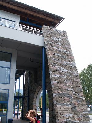 Zaujímavý je aj novopostavený vstupný portál do hypermarketu, ktorý má imitovať čosi ako hradnú vežu. Je totiž kompletne obložený lámaným kameňom. Ešte pozitívnejšie je, že sa jedná o celkom peknú kolekciu hornín, ktoré takto možno pozorovať v zaujímavom "pouličnom múzeu.