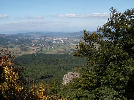 Menšia časť našej výpravy sa odmieta ohrievať na teplom slniečku a odchádza smerom k bralám na západnej strane vrchu. Prechádzame popod prekrásny brezový hájik a na skalnej vyhliadke sa kocháme výhľadom na „hlavný hrebeň“ Štiavnických vrchov (Tanád, Myšia hora, Rosniarky, Paradajz). Jeseň sa už pomaly vkráda do lesov, na skalách však vládne už v plnom prúde – žlté a červené jarabiny sú nádhernou dekoráciou.