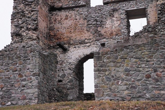Aj keď je možné urobiť si okruh cez Dolný hrad, rozhodujeme sa radšej pre návrat po ceste, ktorou sme prišli. Chodník k nemu je totiž pokrytý šmykľavým ľadom a blatom. Vraciame sa teda k bráne. Tu sa ešte trochu zdržíme. Ja si obzerám horniny v múroch hradu. Prevláda andezit v mnohých farbách – od sivej, cez červenú, zelenkastú až po takmer čiernu. Zaujímavé sú tmavé xenolity a tiež kryštáliky amfibolov.