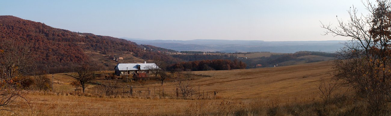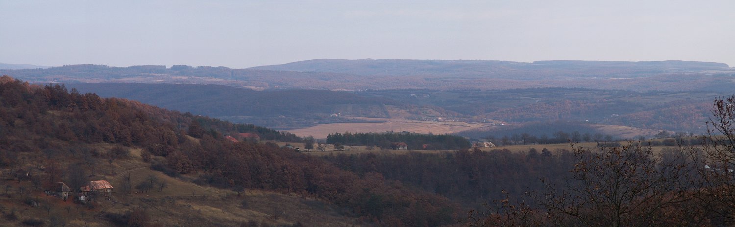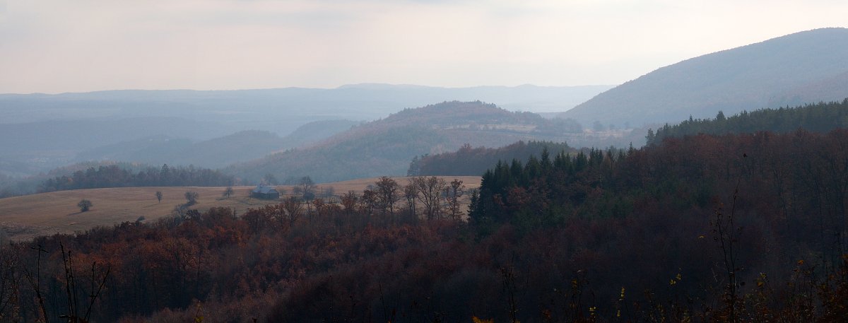 Pohľad z Havrana na východ. Vzadu Krupinská planina, vľavo Stará hora