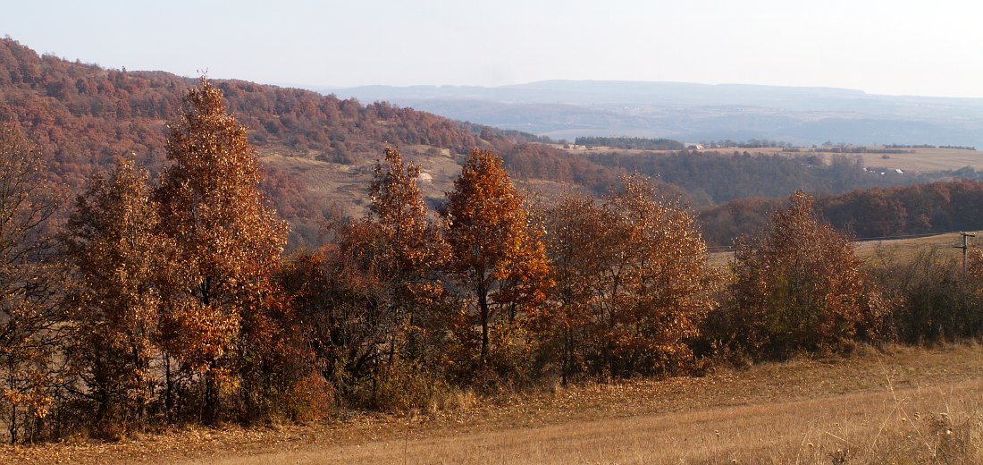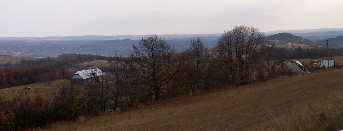 Vpredu krupinské predhorie, vzadu najvyššie kopce Krupinskej vrchoviny v okolí Senohradu