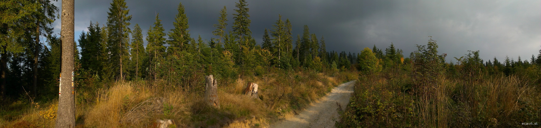 Októbrový večer nad Poliankou. Cesta a rúbanisko je náleziskom pekných hematitov.