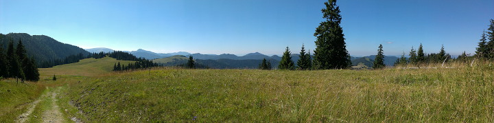 Pohľad zo Smrekovice na horské hrebene nad Ľubochnianskou dolinou. Vľavo Skalná alpa, vzadu Ploská, Borišov, celkom vzadu Tlstá. V popredí lúky na Močidle a Dvorisko.